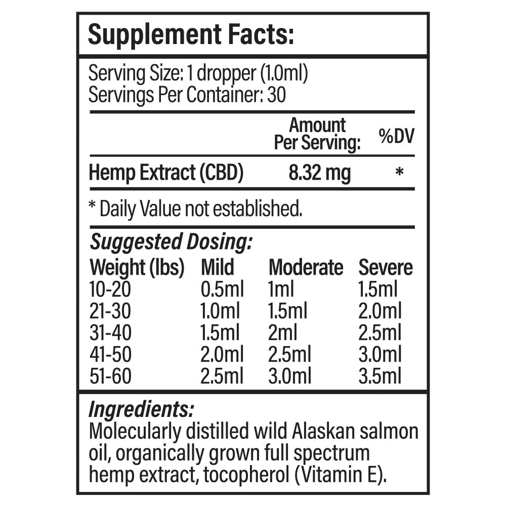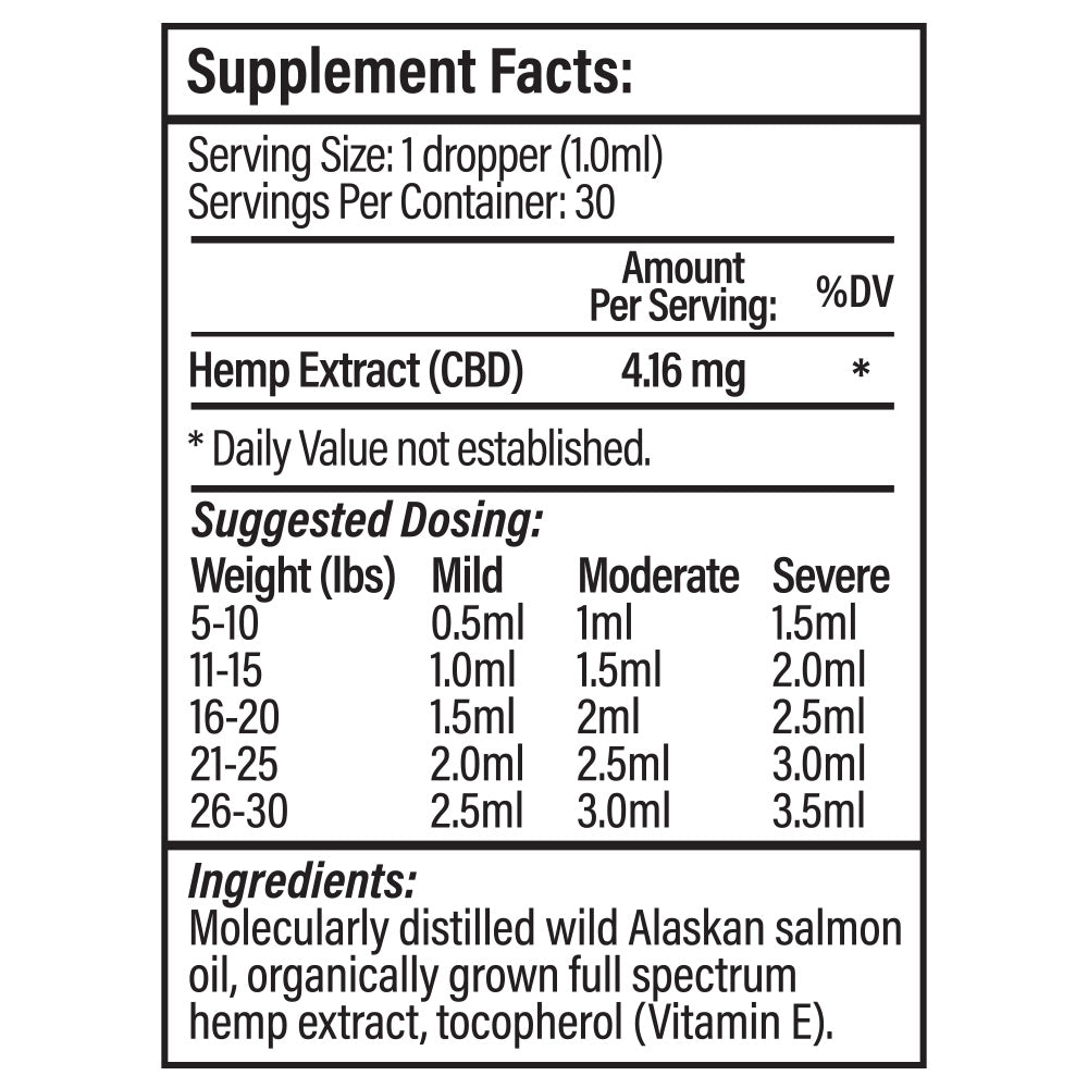 Ingredients: Molecularly distilled wild Alaskan salmon oil, organic broad spectrum hemp extract, tocopherol (Vitamin E)